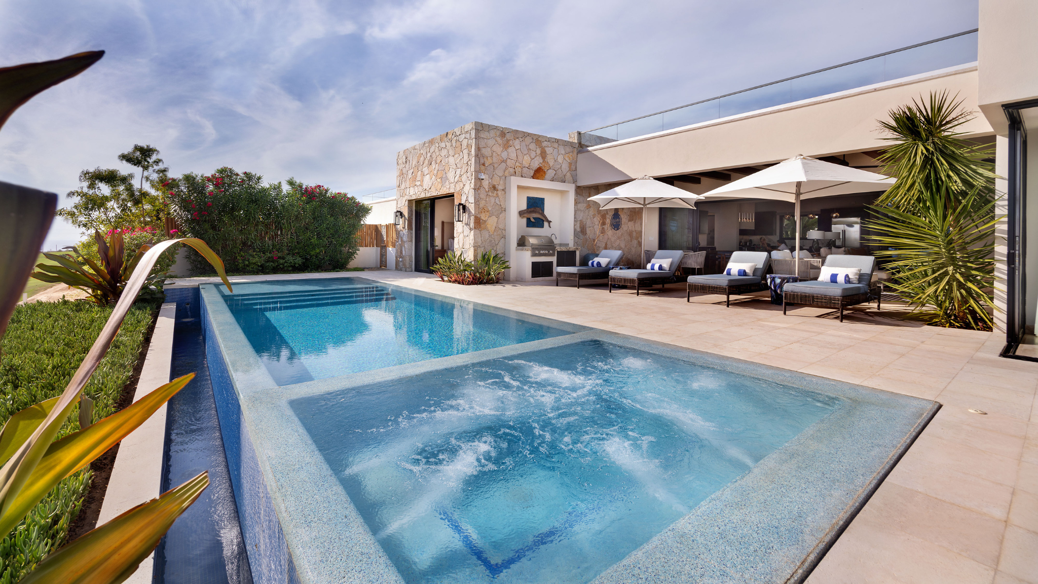 The villa’s outdoor spaces are designed for both relaxation and entertaining, all framed by fairway and ocean views: